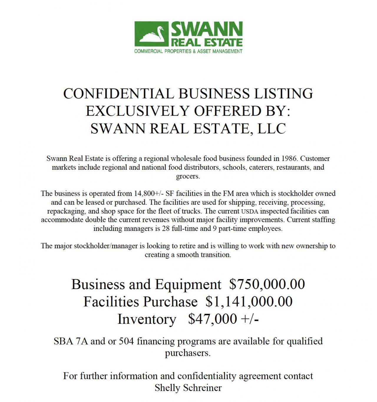 CONFIDENTIAL BUSINESS LISTINGEXCLUSIVELY OFFERED BY:SWANN REAL ESTATE, LLCSwann Real Estate is offering a regional wholesale food procesing business founded in 1986. Customermarkets include regional and national food distributors, schools, caterers, restaurants, andgrocers. Current Minnesota Department of Agriculture Licensed Food Processing Facility.
