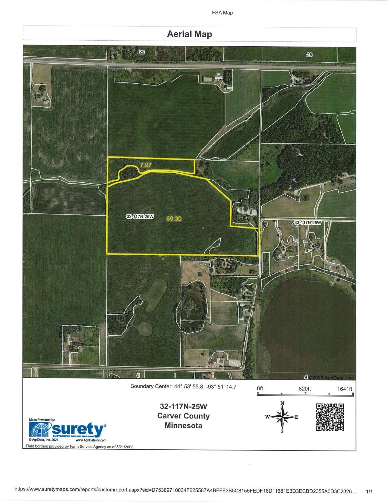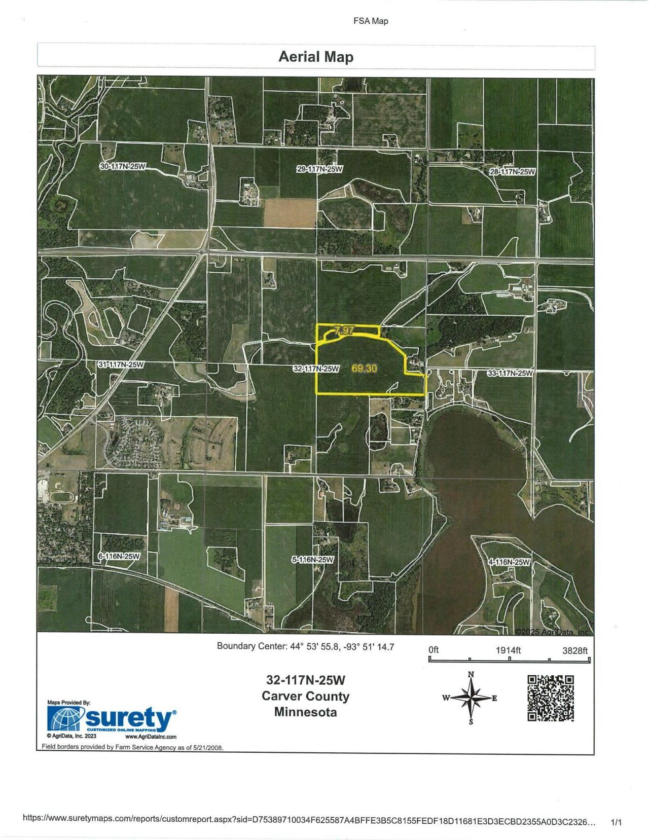 Wonderful 80 acres, certified organic farm land, located just west of the metro area near Hwy 7, easy access, high rolling land and ready to build your dream home, views of Goose Lake, quiet country road, close to city limits of Mayer, great sunrise and sunsets, 77.27+/- acres tillable, well drained, excellent property with all potential, call for maps & details.