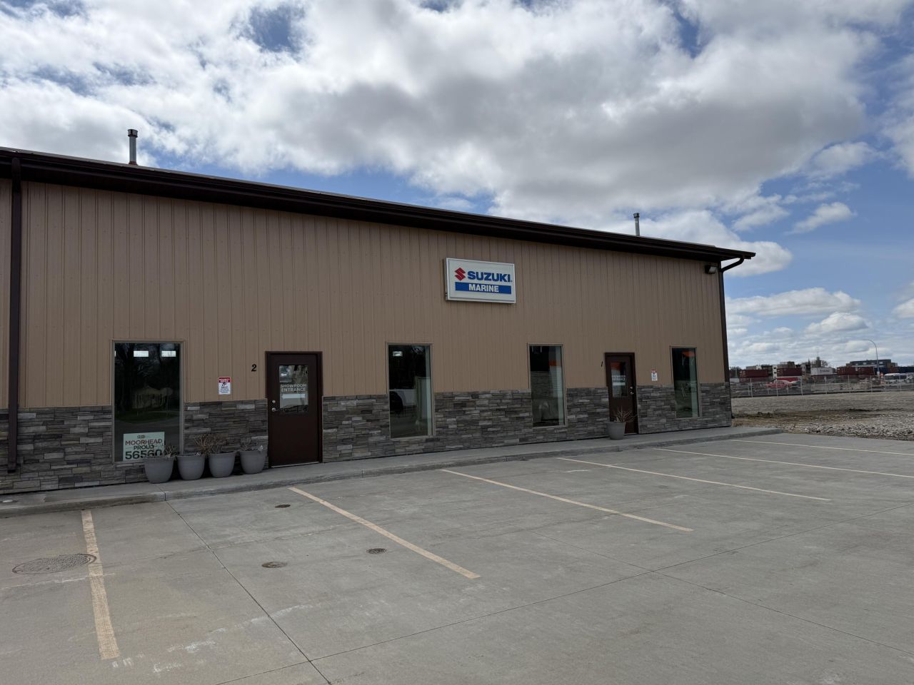 End two units of a versatile commercial property at 1301 1st Ave N in Moorhead, MN. The front is designed for retail customers with a welcoming entrance, while the back features overhead doors and a concrete drive wrapping around for easy access. Ideal for retail, service businesses, distribution, or light industrial use, this property offers great functionality and visibility.