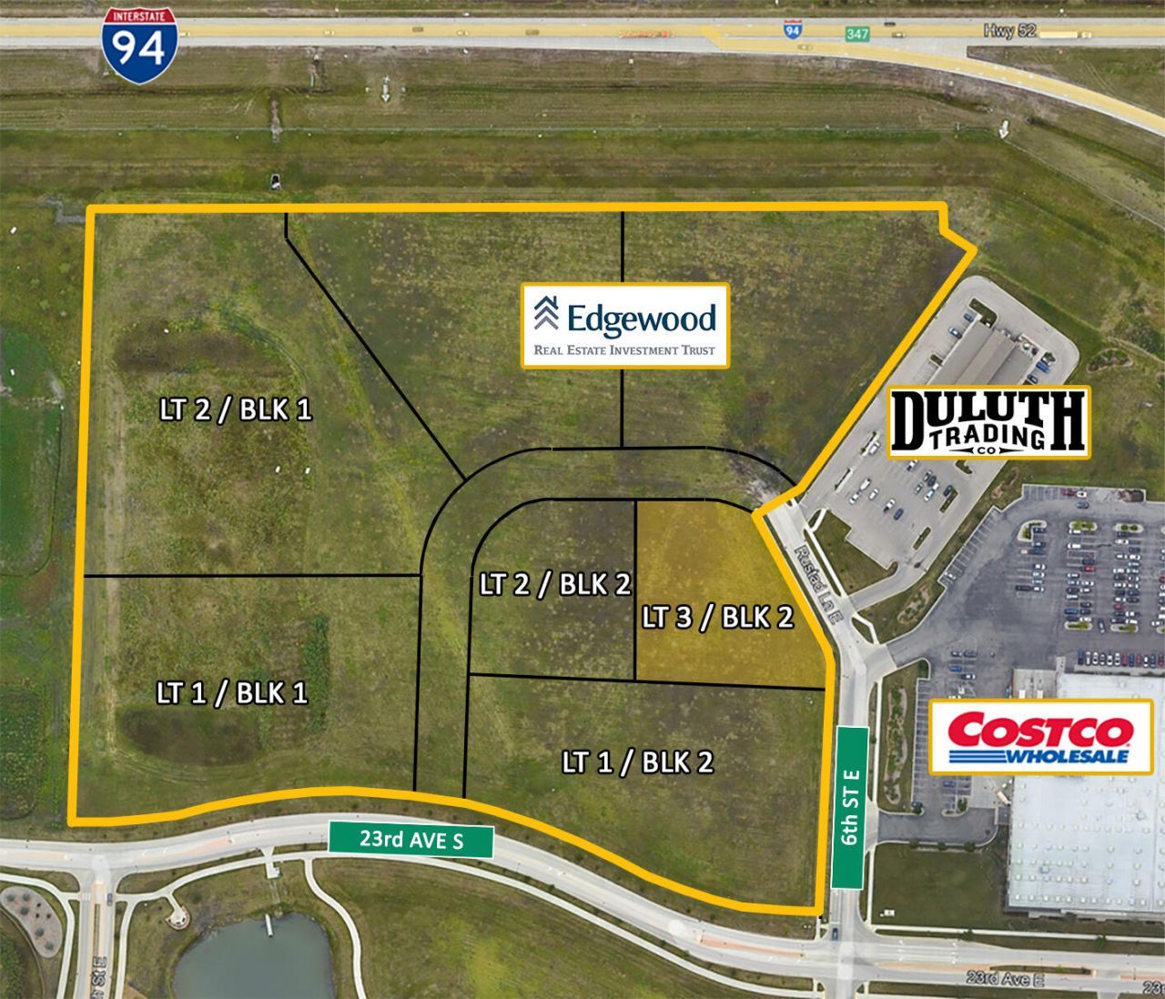 Prime development land on I-94 in West Fargo, adjacent to Costco and Duluth Trading and only 1/2 mile to Sanford Health's premiere regional hospital. Great opportunity for large corporate office center or potential for retail opportunities that can feed off the high traffic volumes. Lots can be sized smaller or larger based on a buyer's requirements. Do not miss out on this rare opportunity.