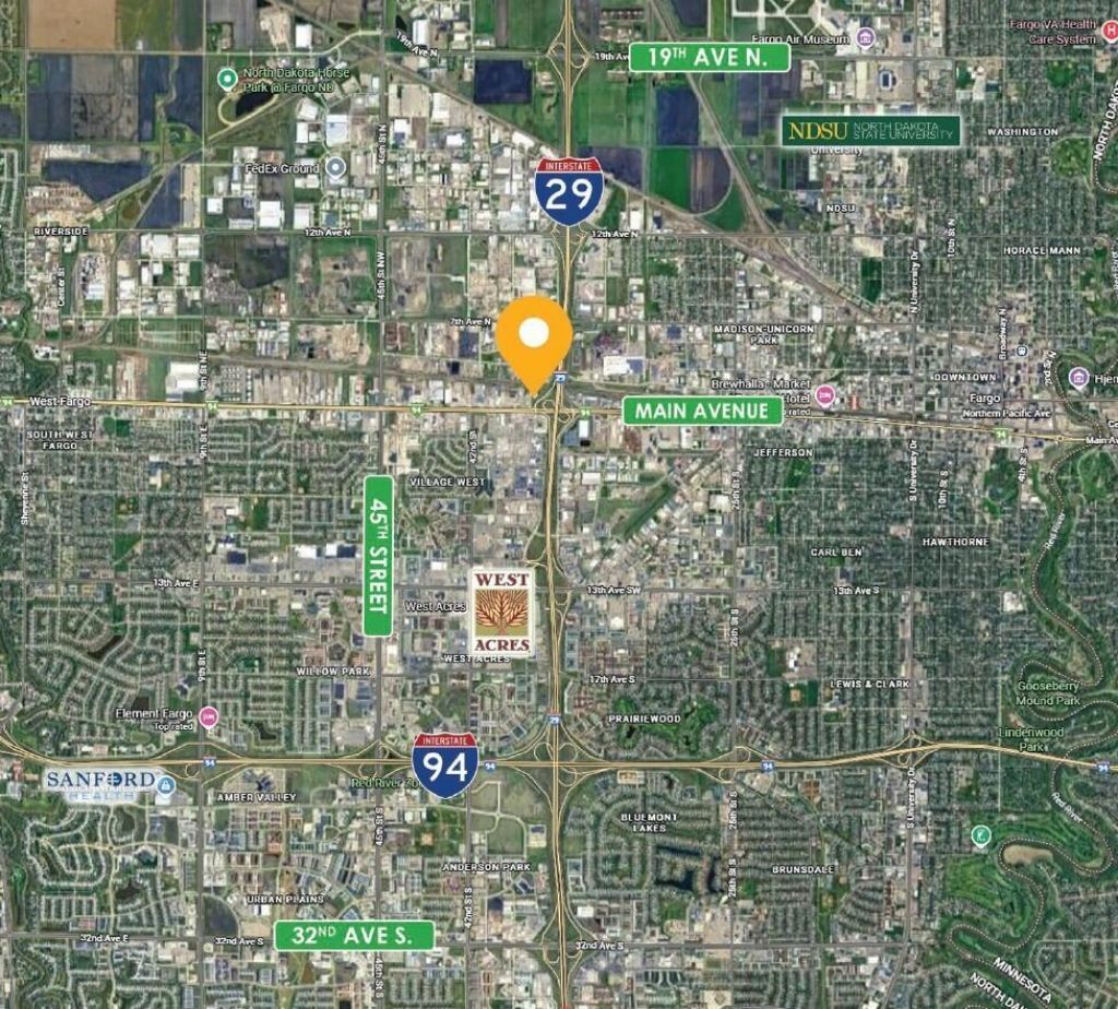 Strategically located at the high-exposure corner of Main Ave & I-29 (76k+ VPD combined), this Olaf Anderson-built steel-frame building and huge yard offers premium showroom/office space plus fully sprinkled, dock-accessible warehouse. Rare amenities include elevated deck & finished patio w fireplace/kitchen. 2.7+ acres w/ adjacent lot allows expansion, parking, or storage. Available summer 2026.
