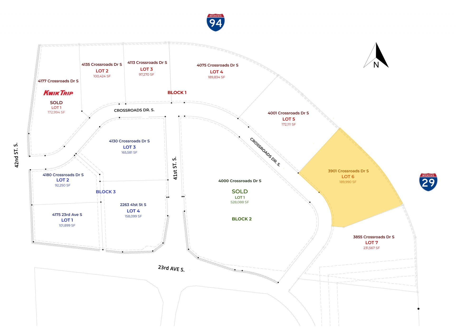 Buy, build or lease in the epicenter of the FM metro with land in The Crossroads! Adjacent to I94 & I29, this site features the highest combined traffic counts in N.D. (over 144k vehicles/day)! Great access with lots from .7-10+ acres to support a large mix of uses, including professional office, medical, retail, technology, education & more. This central location is <10 minutes to anywhere in FM!