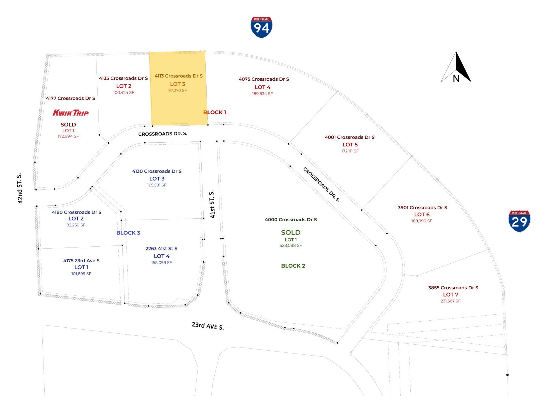 Buy, build or lease in the epicenter of the FM metro with land in The Crossroads! Adjacent to I94 & I29, this site features the highest combined traffic counts in N.D. (over 144k vehicles/day)! Great access with lots from .7-10+ acres to support a large mix of uses, including professional office, medical, retail, technology, education & more. This central location is <10 minutes to anywhere in FM!