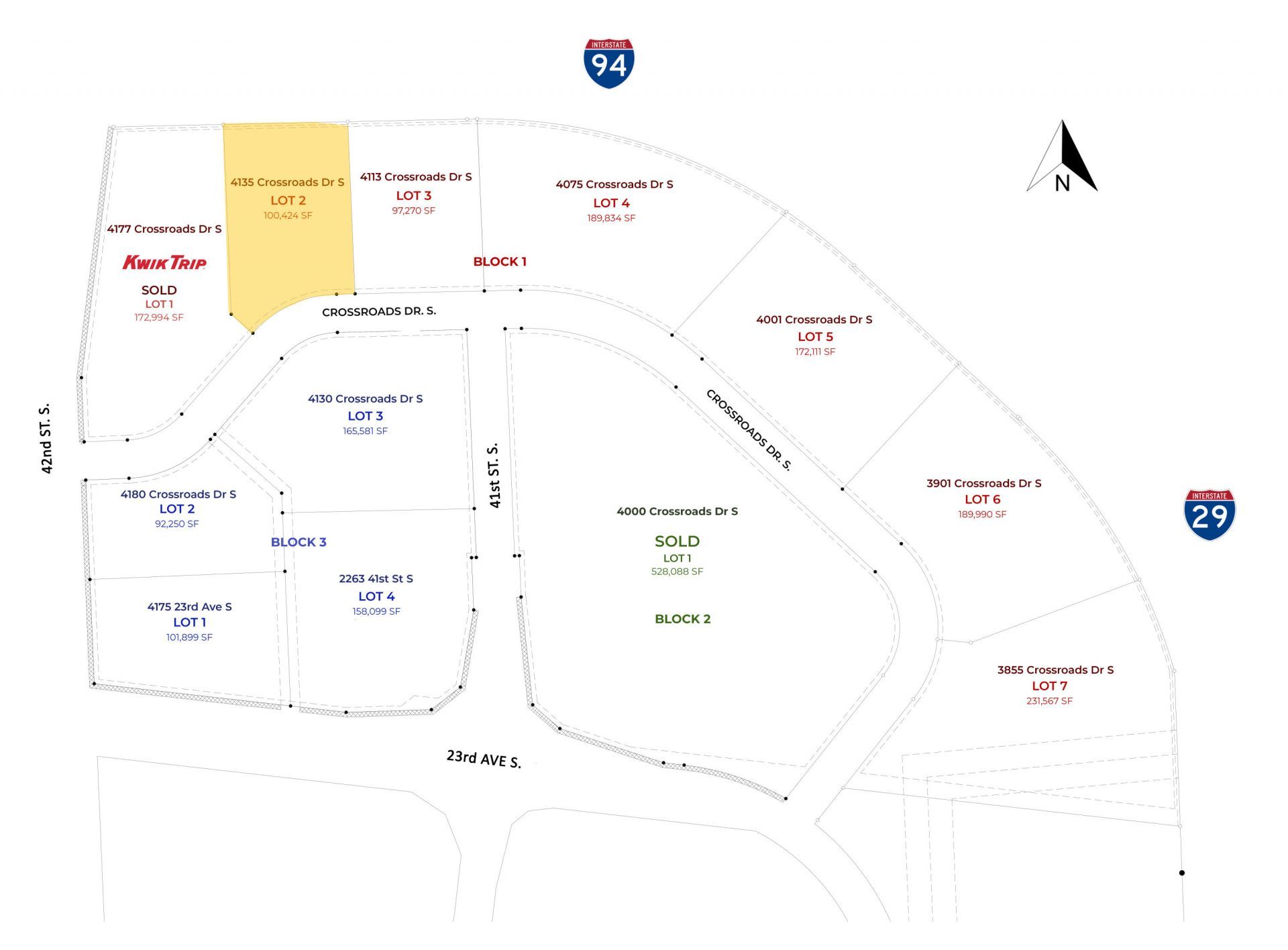Buy, build or lease in the epicenter of the FM metro with land in The Crossroads! Adjacent to I94 & I29, this site features the highest combined traffic counts in N.D. (over 144k vehicles/day)! Great access with lots from .7-10+ acres to support a large mix of uses, including professional office, medical, retail, technology, education & more. This central location is <10 minutes to anywhere in FM!