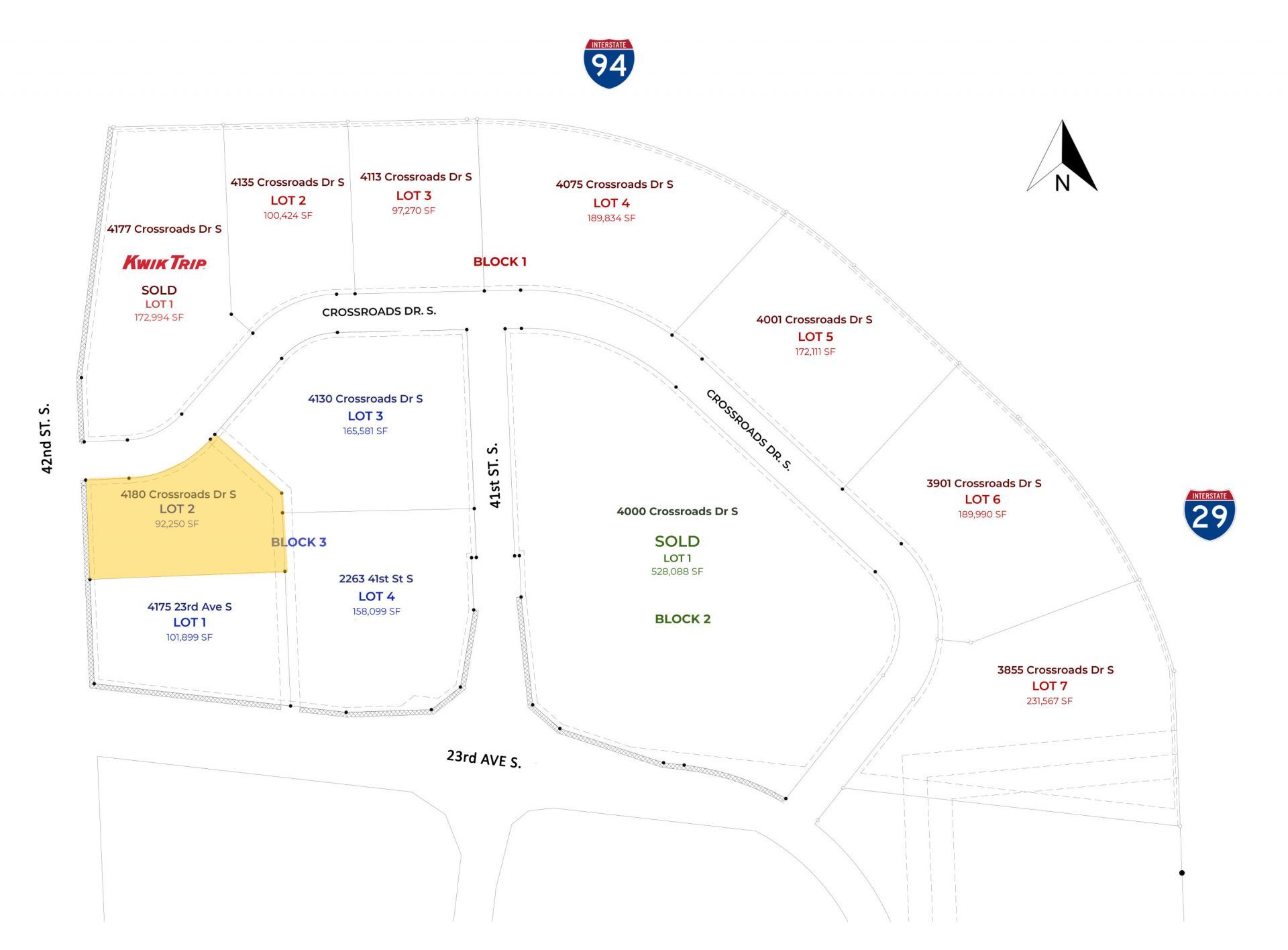 Buy, build or lease in the epicenter of the FM metro with land in The Crossroads! Adjacent to I94 & I29, this site features the highest combined traffic counts in N.D. (over 144k vehicles/day)! Great access with lots from .7-10+ acres to support a large mix of uses, including professional office, medical, retail, technology, education & more. This central location is <10 minutes to anywhere in FM!