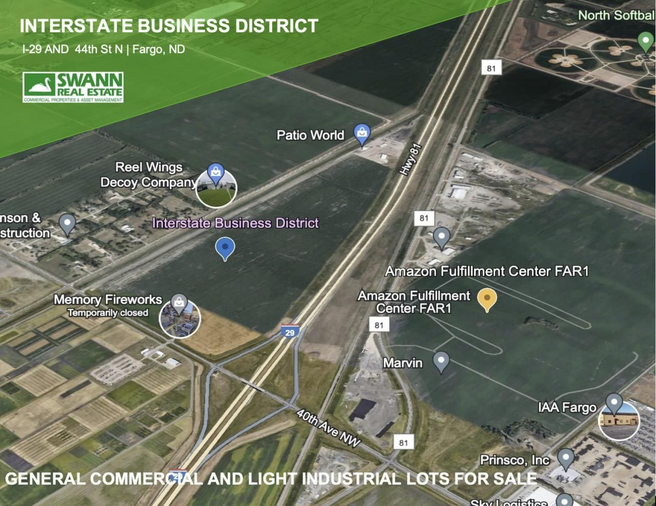 Interstate Business DIstrict / I-29 and 40th Ave N. 4350 44th St. N. Fargo, ND. 58102 Located acrross I-29 from 1.3 million Sq/Ft Amazon Distribution Center and South of NDSU / Hector International Airport. Recently Zoned GC and LI. Seller open to Build to Suit or Design Build lease. Specials projected to be under $2.50SF