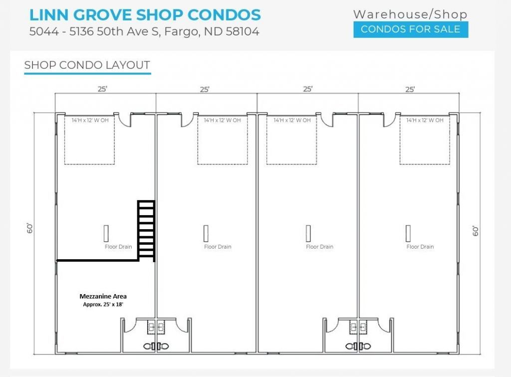 Rare opportunity to purchase a highly desirable Linn Grove Shop Condo in South Fargo. Conveniently located just off 52nd Avenue South between Veterans Blvd and 45th Street. This 25' x 60' end-cap unit features a bonus 25' x 18' mezzanine area! The end unit offers additional windows, floor drain, bathroom, LED lighting throughout, and much more.