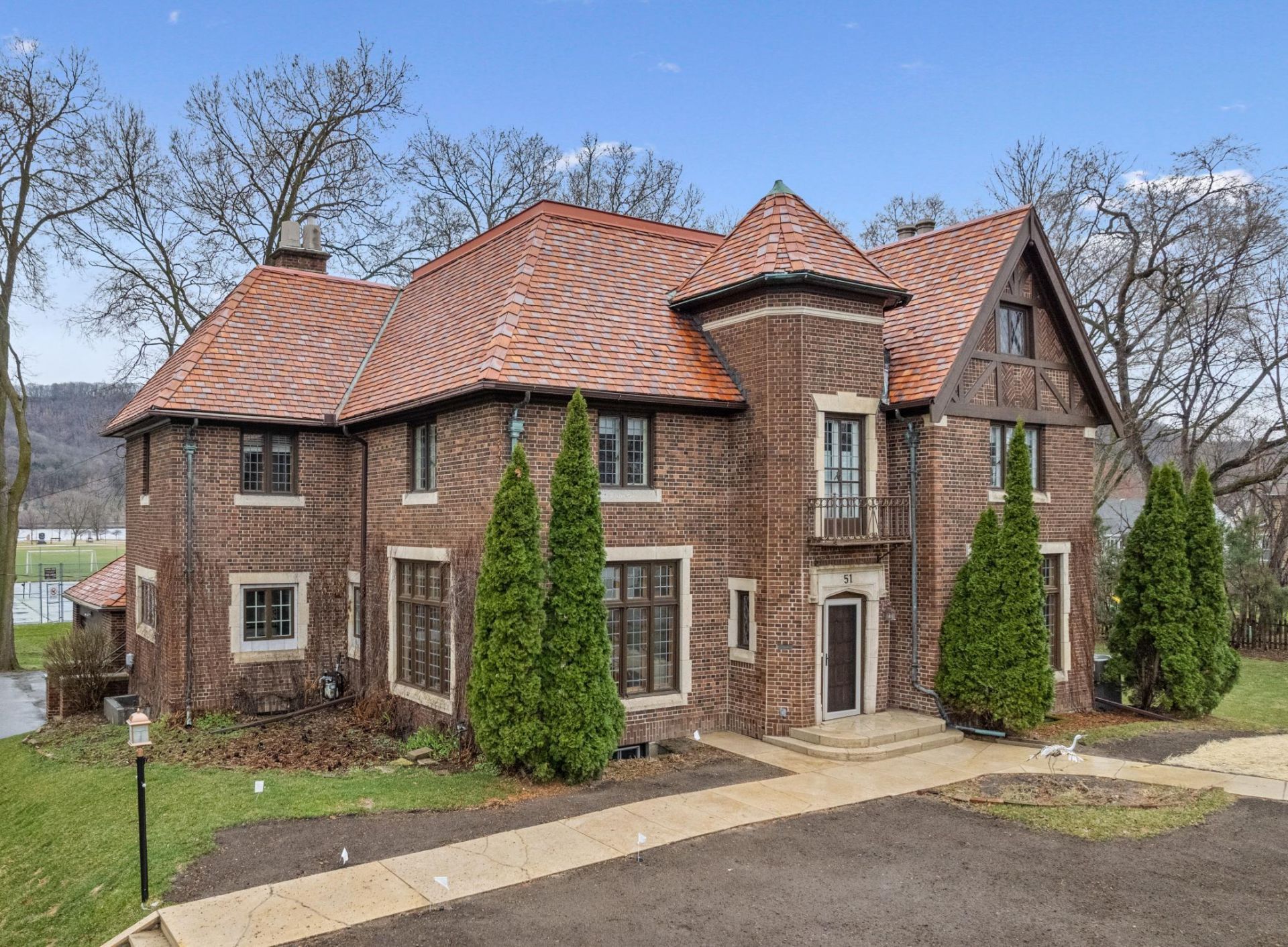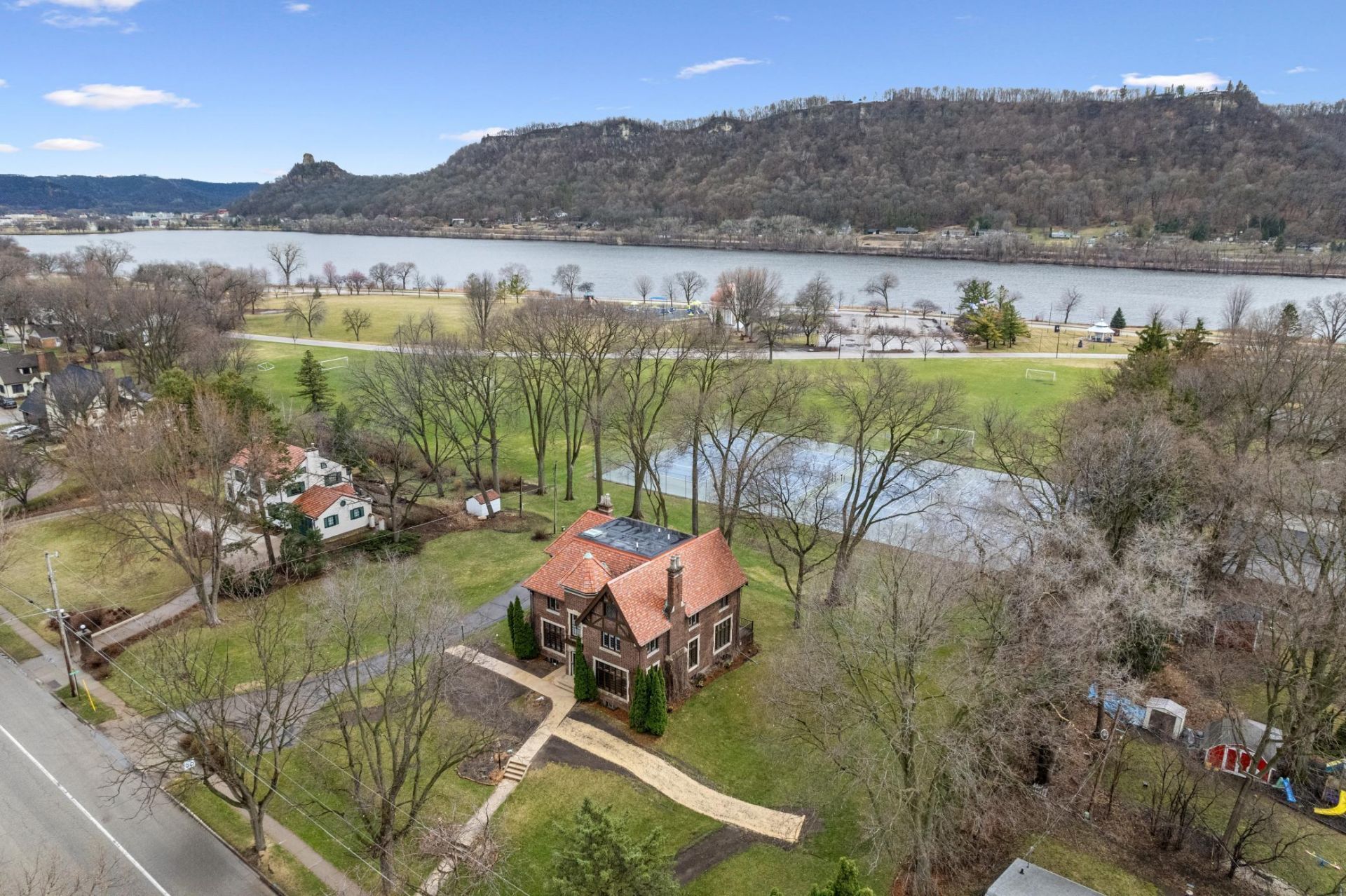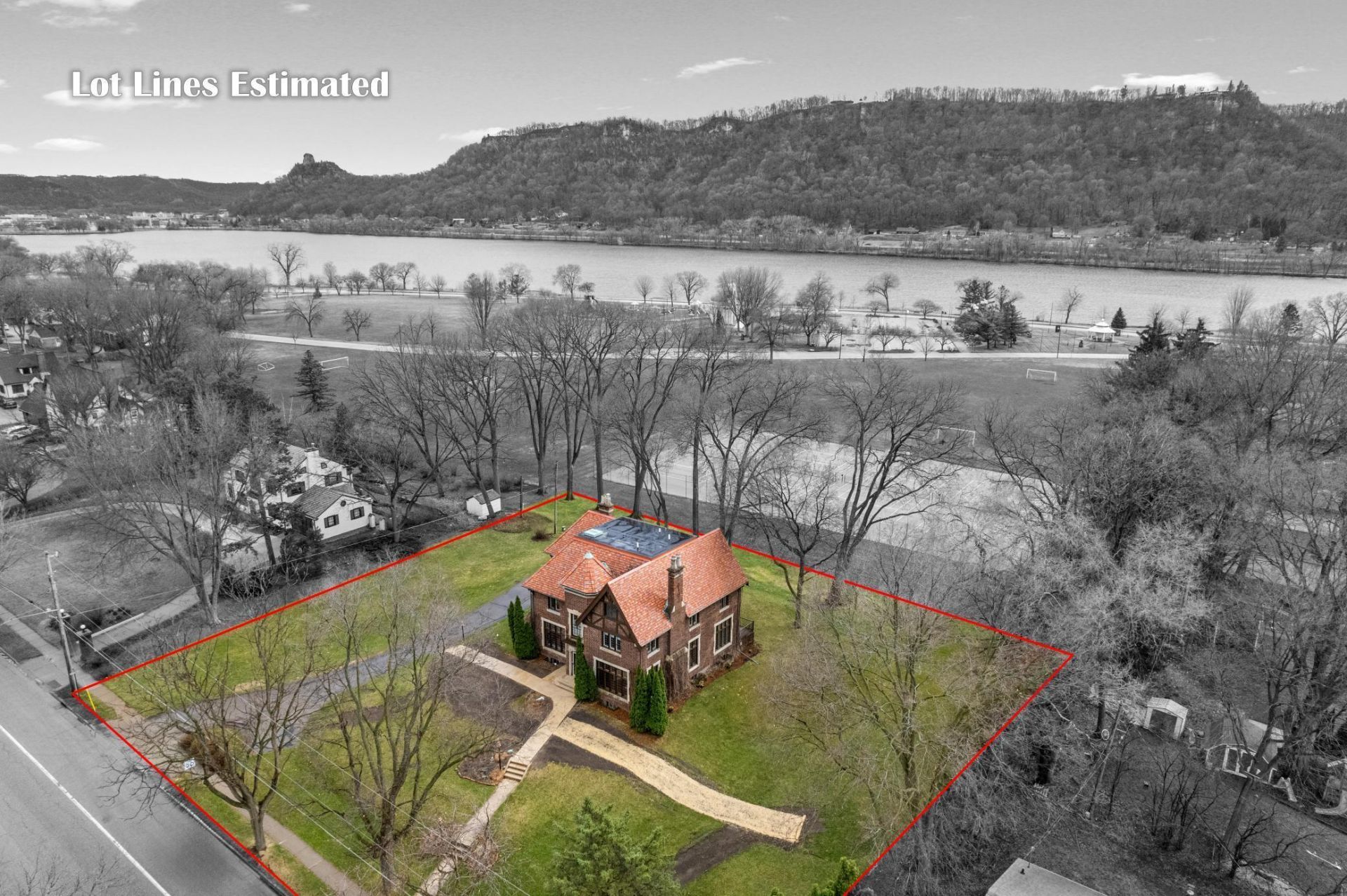 This stately 5 Bedroom, 5 Bathroom 1930 English Tudor offers an incredible location in the heart of Winona with sweeping views of the Bandshell, Veteran's Park, Lake Winona and Sugar Loaf. It is packed with charm inside and out. Adjacent to four city owned tennis/pickleball courts, it is situated on 3 city lots. The all-brick exterior has intricate pattern design and Biesanz stone highlights. A tile roof and leaded glass windows add to the curb appeal.Interior features include original hardwood floors, an updated kitchen with quartz countertops and custom tile bathrooms. The main level has 9-foot ceilings and beautifully textured plaster...read more