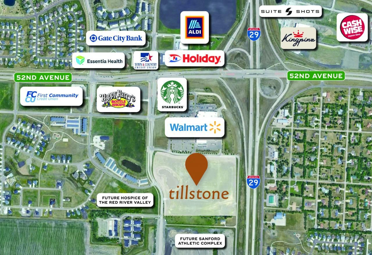 Commercial lots at Tillstone offer a well-connected location just south of Walmart with visibility from I-94 and 52nd Ave South. The development's proximity to surrounding residential neighborhoods, commercial businesses and retailers complement the site's visibility with strong consumer traffic. Locate your business in the middle of the fastest growing area of town. *Shared retention pond*