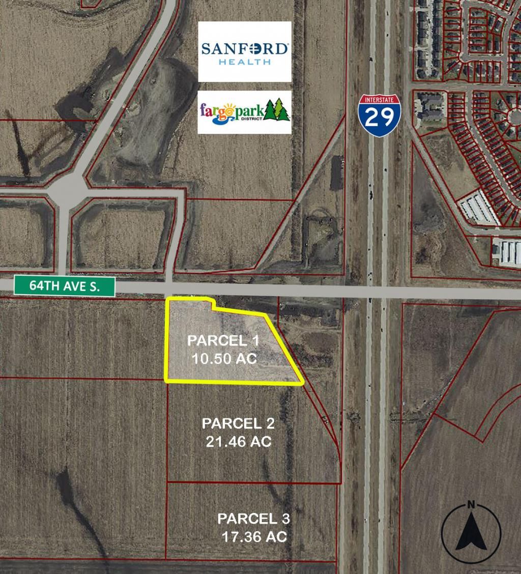 Development Land on the southern edge of Fargo, ND, along 64th Ave S. & I-29. Directly to the north, construction has begun on the new Sanford Sports Complex. Overpass adjacent to the site was completed late 2022. On and off ramps are planned to be installed in 5 years. Traffic count on Interstate I-29: 17,700. The City of Fargo Growth Plan shows parcel as Commercial and High Density Residential