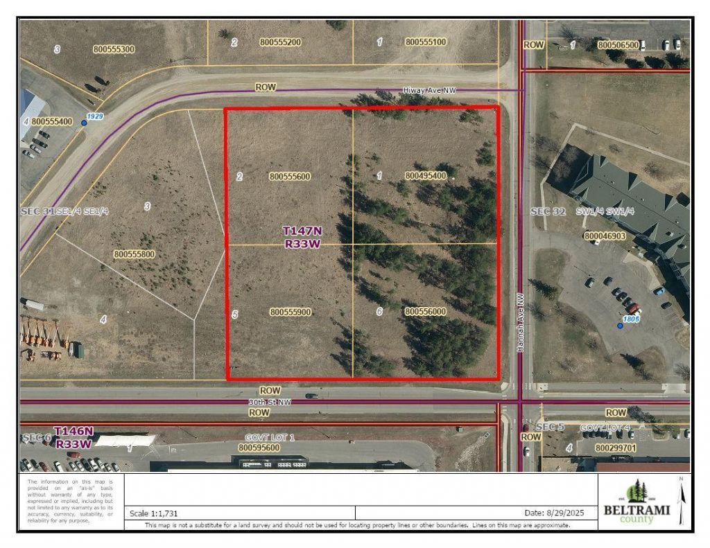 Nearly four acres just off Paul Bunyan Drive NW, blocks from Sanford Medical campus, right behind Walmart. Fantastic location, good traffic counts (about 4k on each leg), good visibility from highway 71. NOTE: Deed Restriction: No multi-family housing.